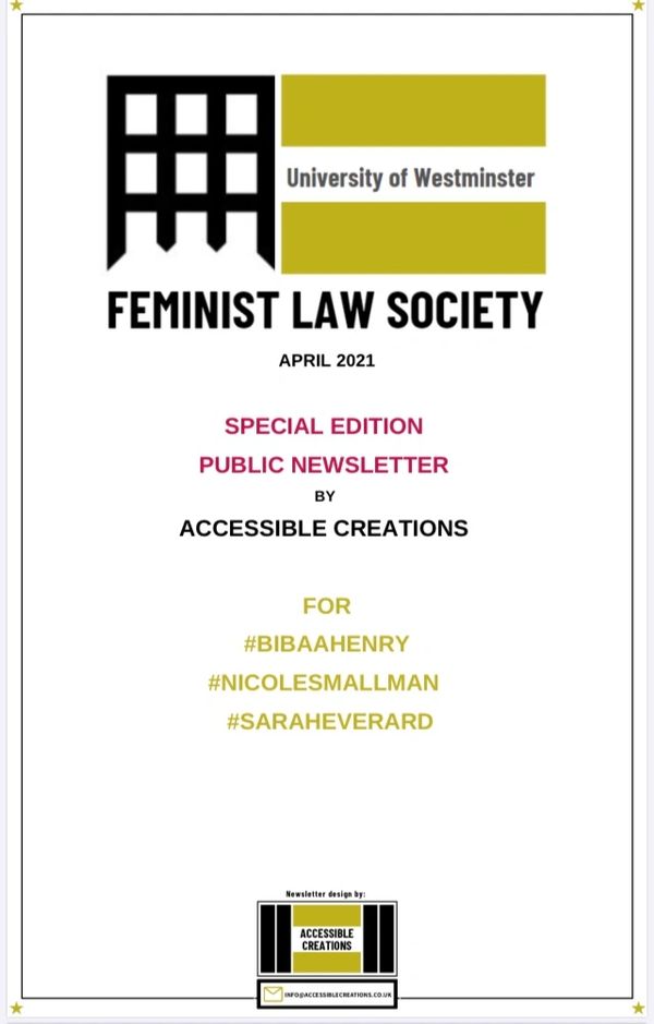 Accessible Creations created all of the newsletters, event advertising and the educational, feminist law, resources that supplemented University of Westminster Feminist Law Society events for the committee cohort of 1 August 2020 - 31 July 2021.